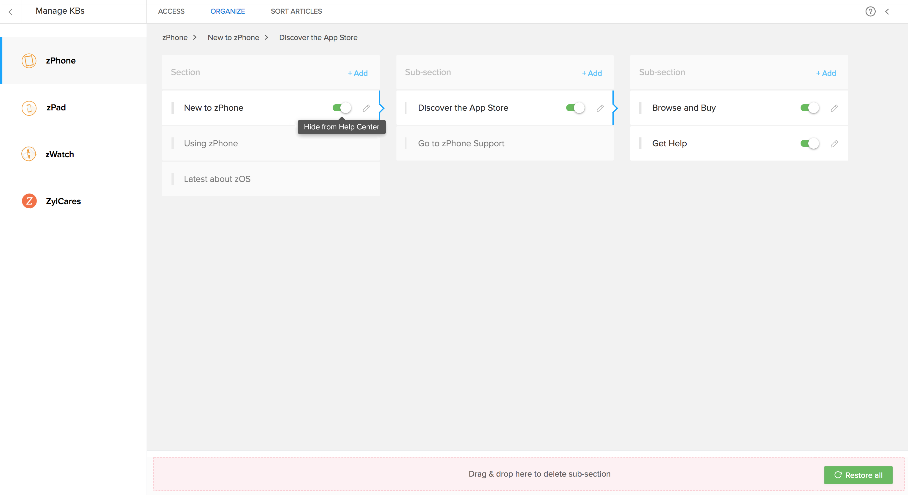 - Passe o ponteiro do mouse sobre a seção e, em seguida, ative a opção ' Ocultar da Ajuda Cente r' para DESATIVADO .