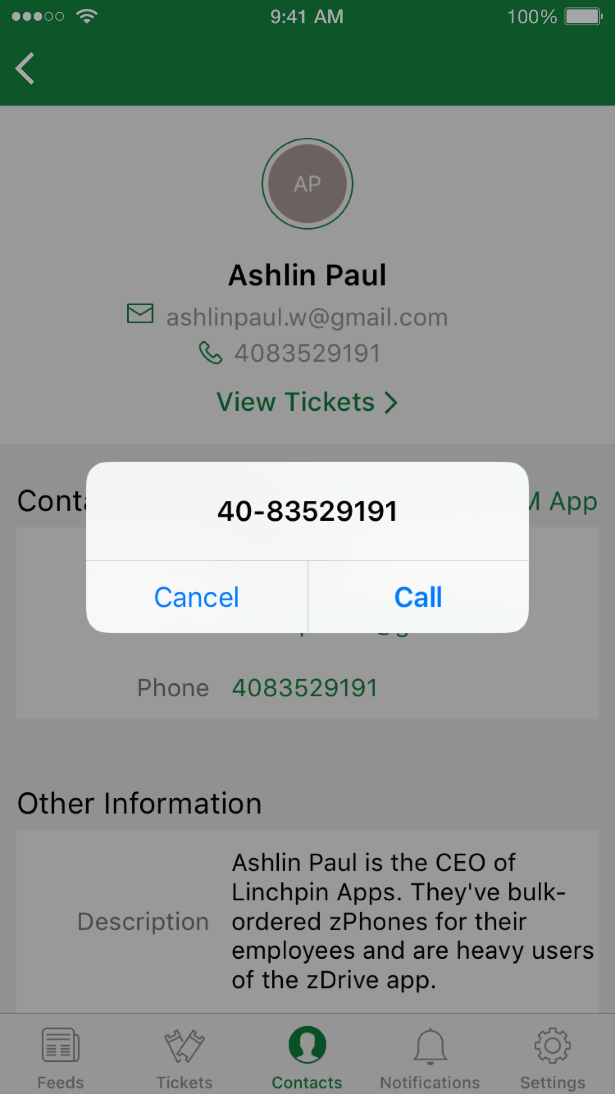 Você pode usar o recurso arrastar e soltar para arrastar e soltar as informações de contato do módulo Contatos para qualquer outro módulo. Por exemplo, você pode arrastar o ID ou número de telefone do módulo Contatos e colar o mesmo em uma página Adicionar ticket do módulo Tickets ou arrastar as informações de contato e enviá-las como anexo na página Adicionar status do módulo Feeds .
