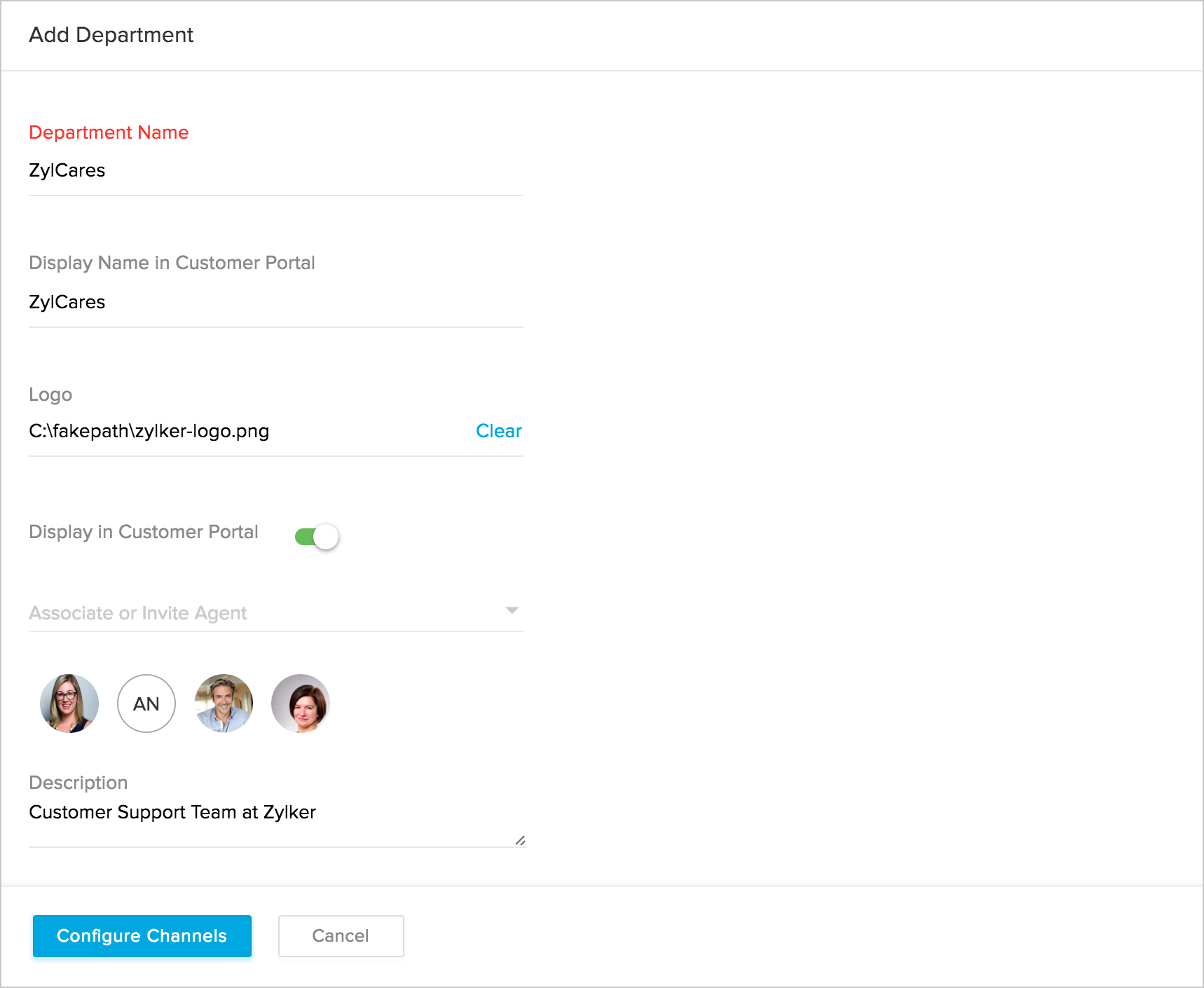 Logotipo : Procure e selecione um logotipo para o departamento. O logotipo é usado para identificar o departamento na Central de Ajuda
