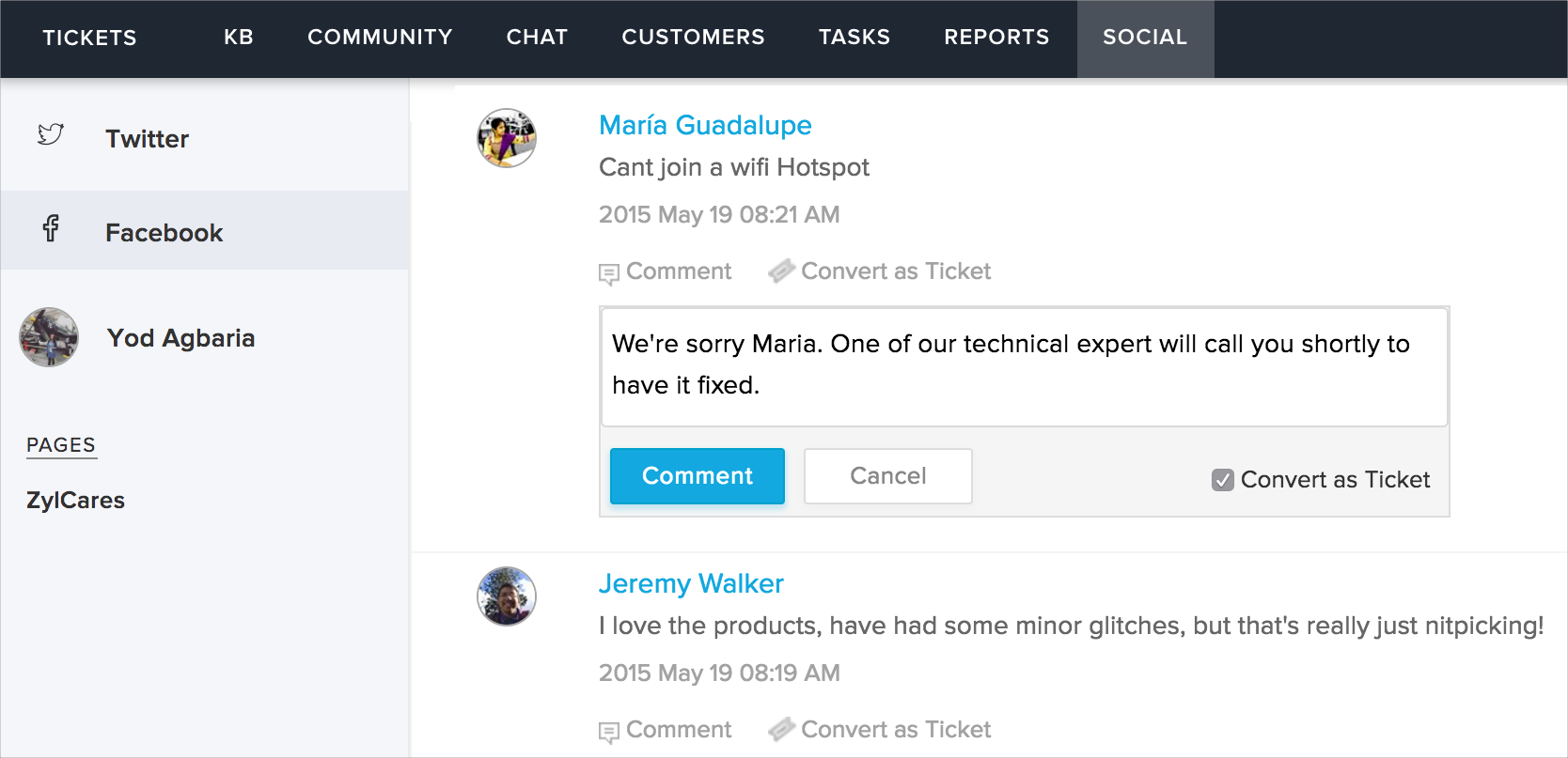 Você pode clicar em Converter como ticket ao lado de uma postagem para convertê-lo em um ticket. Os comentários deixados em um ticket serão adicionados à postagem no Facebook do cliente e ao ticket correspondente no Zoho Desk. Você pode clicar em Mostrar ticket ao lado de uma postagem convertida para exibir seu respectivo ticket no módulo Tickets.