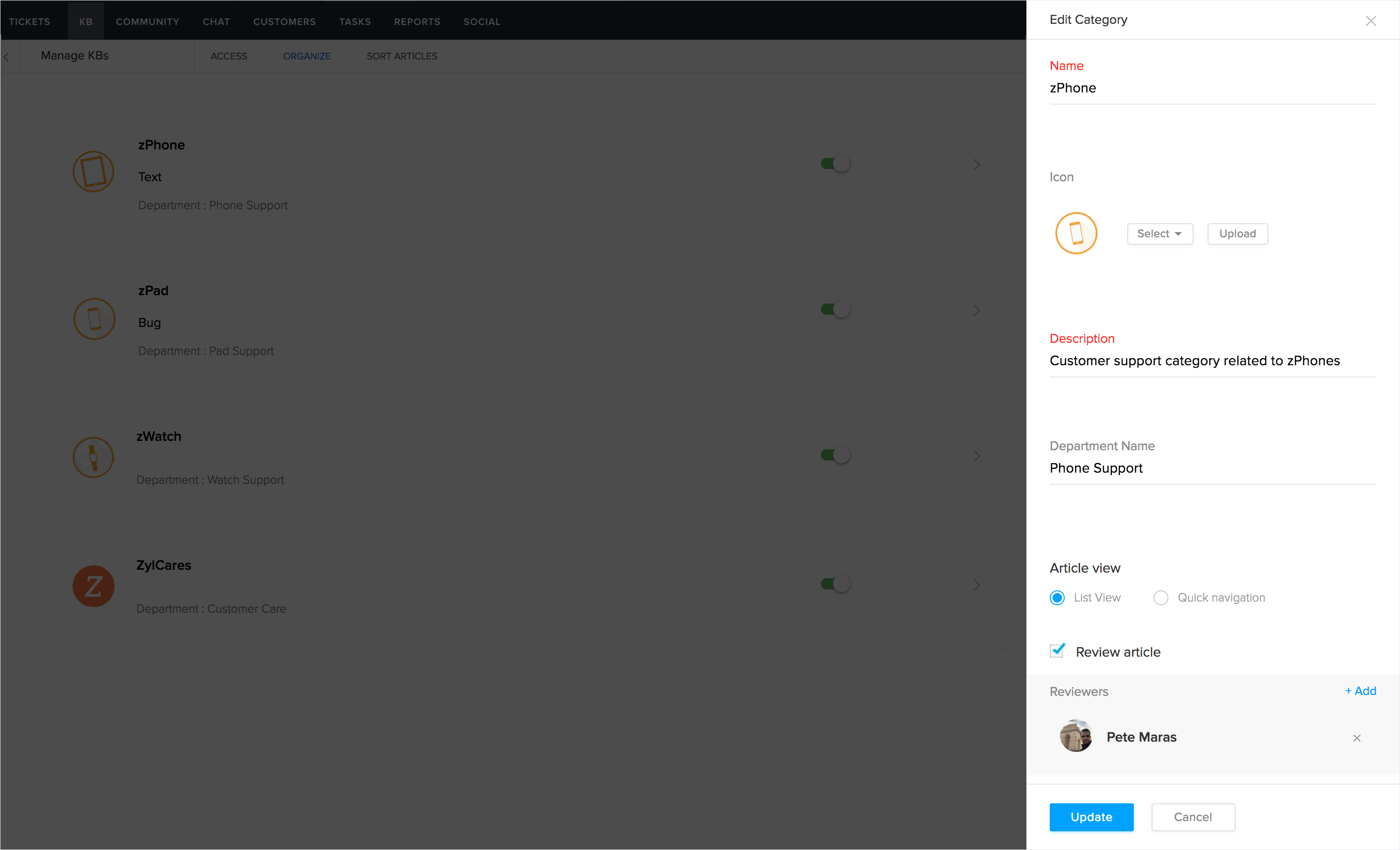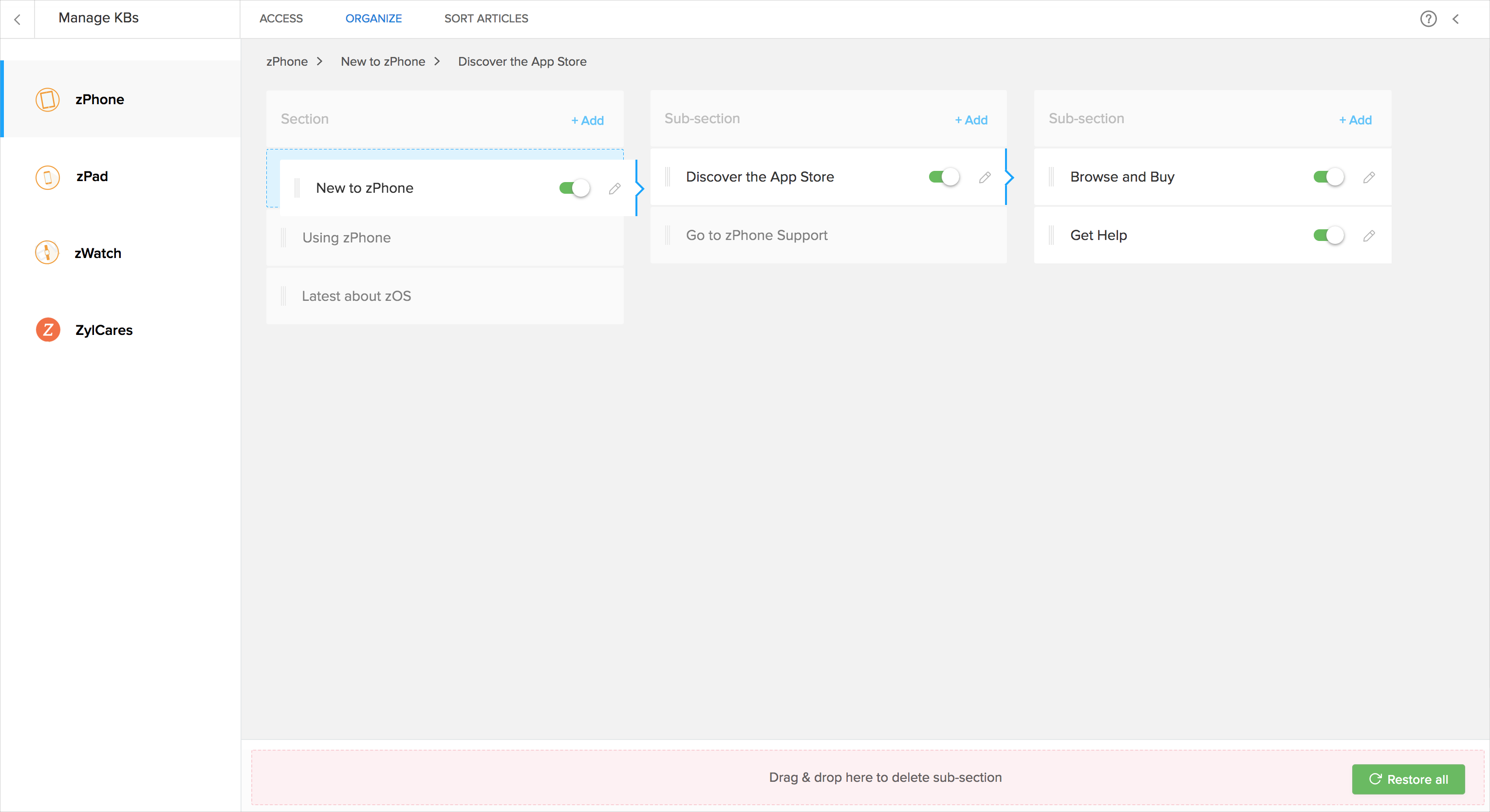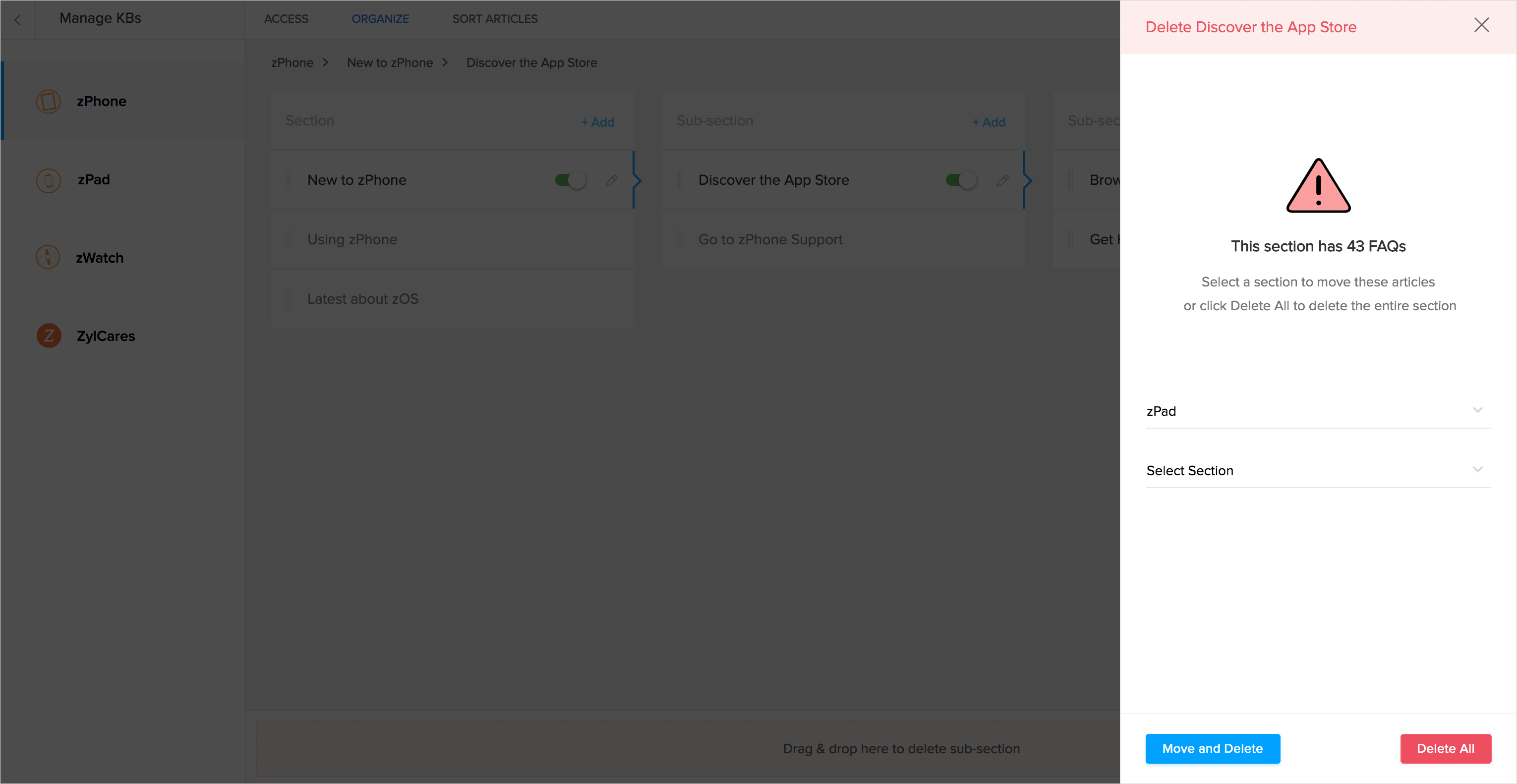 Você pode mover os artigos em uma pasta do KBase para uma seção diferente dentro de uma categoria.Por exemplo, vamos considerar que você tem duas seções, ou seja, Zylker Tablets e Zylker Handhelds.Você pode mover os artigos em Comprimidos Zylker para os Handhelds Zylker. Nesse caso, a seção Zylker Tablets será adicionada como uma subseção ao Zylker Handhelds e os artigos serão movidos para baixo dela.